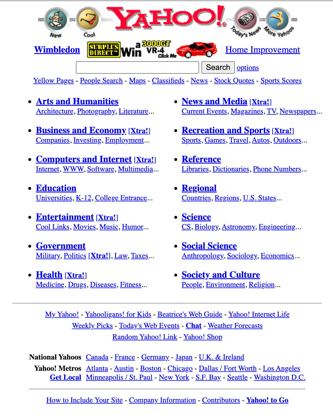 Bien rapidement, il a fallu s’équiper pour pouvoir naviguer dans un nombre croissant de sites et de contenus. Les premiers “portails” ont tenté une approche manuelle et éditorialisée : des hordes d’experts thématiques s’occupaient de lister les nouveautés du “cyberespace”, en proposant à leurs visiteurs une sélection qui n’était pas sans rappeler les magazines de l’ancien monde.